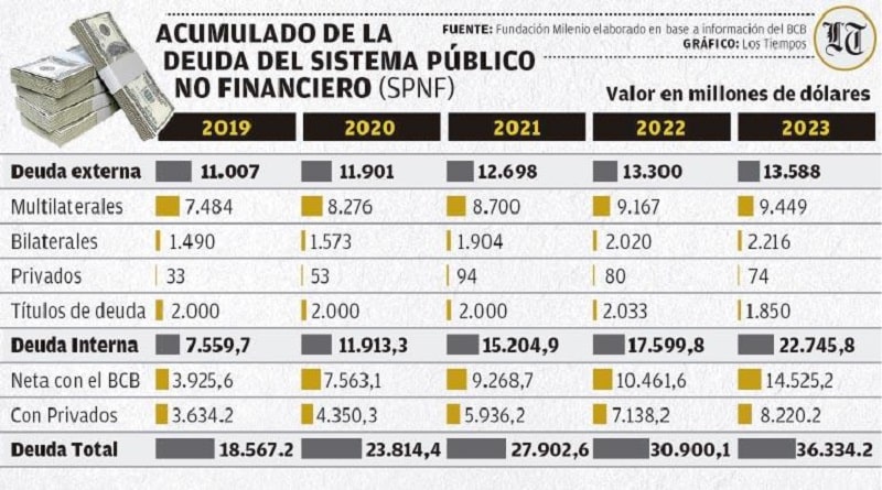 La deuda pública de Bolivia ha experimentado un notable crecimiento en el último año, aumentando un 10% del Producto Interno Bruto (PIB), equivalente a aproximadamente 5.400 millones de dólares, según un reciente informe de la Fundación Milenio. El principal financiador de esta deuda ha sido el Banco Central de Bolivia (BCB), que ha aportado el […]