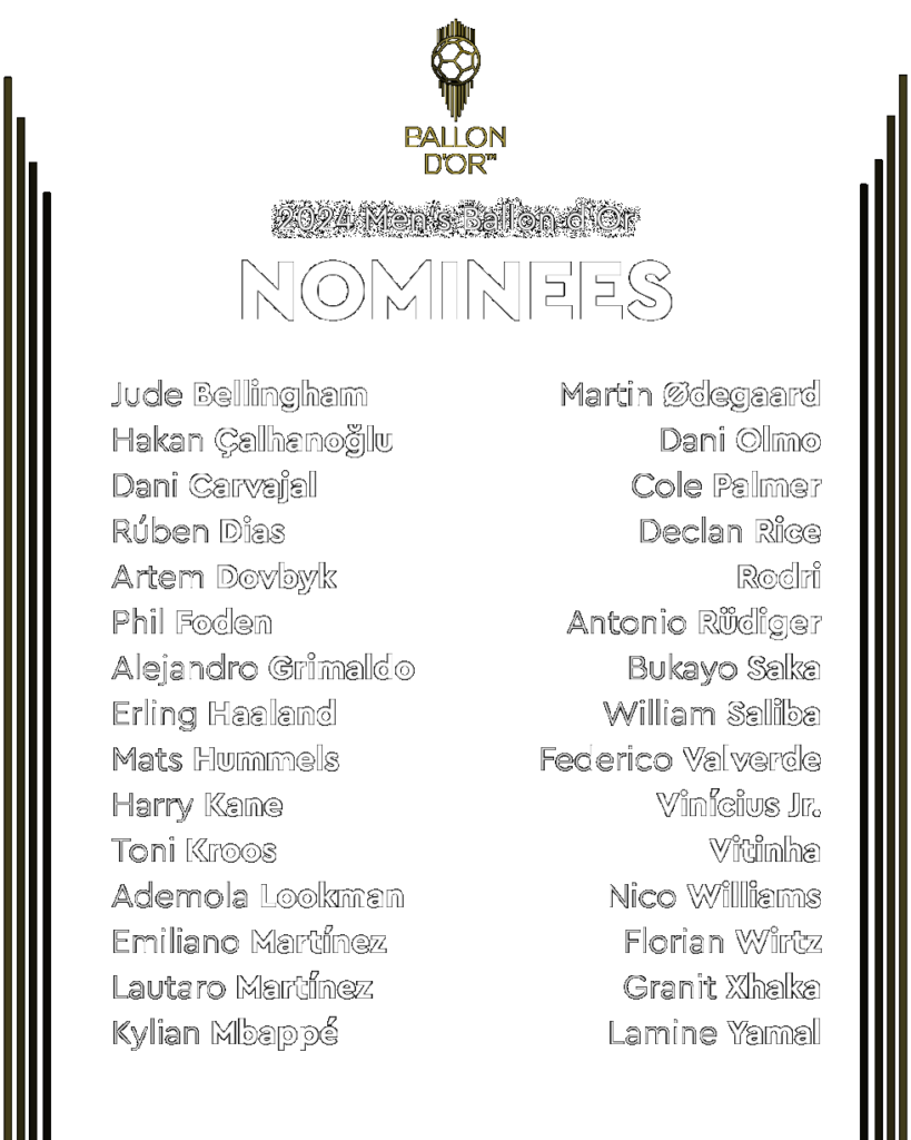 Seis futbolistas españoles aspiran al Balón de Oro de este año tras el triunfo en la Eurocopa, Nico Williams, Dani Olmo, Rodri, Dani Carvajal, Lamine Yamal y Alejandro Grimaldo, y la presencia latinoamericana la encabeza Argentina, con el portero Emiliano Martínez y el delantero Lautaro Martínez.