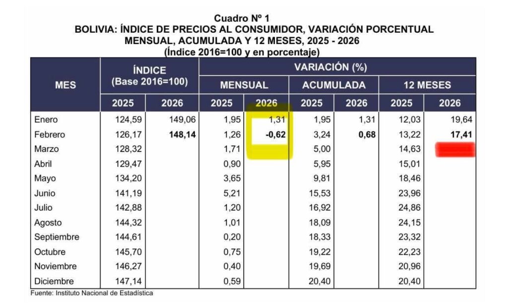 Según las cifras oficiales, la inflación mensual fue de 1,31% en enero y bajó a terreno negativo en febrero. En tanto, la inflación acumulada en lo que va de 2026 alcanza el 0,68%, mientras que la variación a 12 meses se ubica en 17,41%.