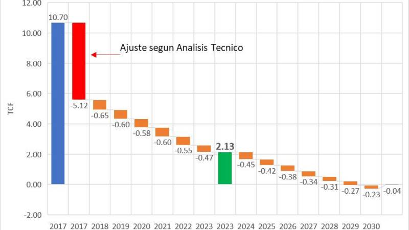 “Esta cifra resulta de descontar las reservas certificadas ajustadas, por la producción entre los años 2018 y 2023, que se estima fueron de 3.45 TCF. Naturalmente, la estimación del nivel de reservas en 2.13 TCF es provisional, y entretanto no se conozca la certificación oficial pendiente”, señala la Fundación Milenio.