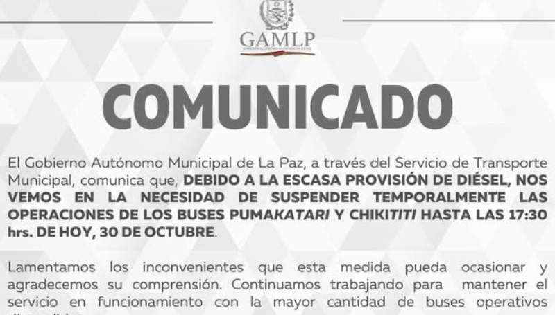 El Gobierno Autónomo Municipal de La Paz informó que, ante la escasa provisión de diésel, el Servicio de Transporte Municipal se vio obligado a suspender temporalmente las operaciones de los buses Pumakatari y Chikititi.