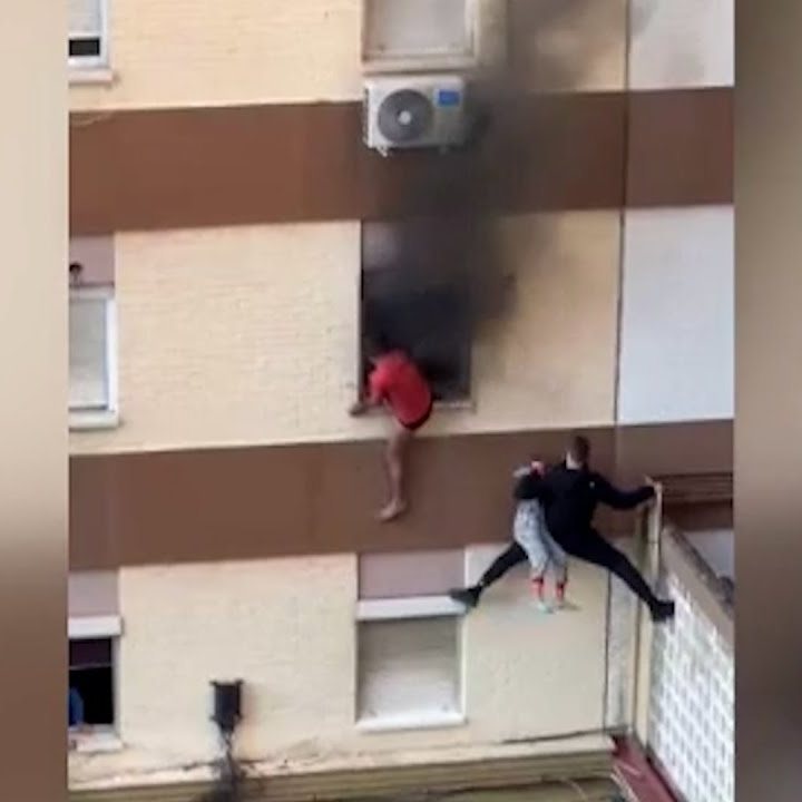 En las imágenes, emitidas en un primer momento por Antena 3, se puede ver como el hombre consigue agarrar a dos niños, de 2 y seis años de edad, con su mano izquierda y los lleva al otro lado del muro, lejos del fuego. Durante todo el tiempo, usa su otra mano, la derecha, para sostenerse y no caer.
