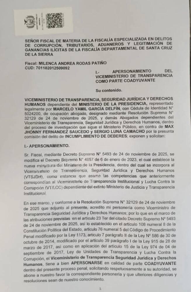 El Viceministerio de Transparencia, Seguridad Jurídica y Derechos Humanos se constituyó como parte coadyuvante en la investigación que sigue el Ministerio Público contra el alcalde de Santa Cruz de la Sierra, Jhonny Fernández, y el funcionario Sergio Luna Camacho, por la presunta comisión del delito de incumplimiento de deberes en el denominado caso “pavimento fantasma”.