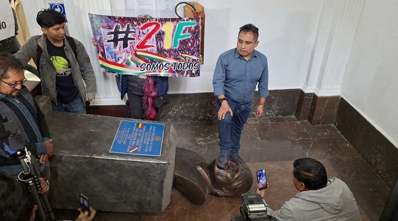 Con la ayuda de activistas del movimiento Bolivia Dijo No, Astorga volteó el busto de Morales y le piso la cabeza, como un acto de condena hacia la figura del exmandatario.