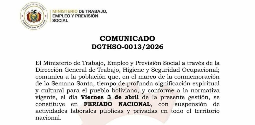 Además, se confirmó que el viernes será feriado nacional por Viernes Santo, por lo que se suspenderán las actividades laborales tanto en el sector público como privado.