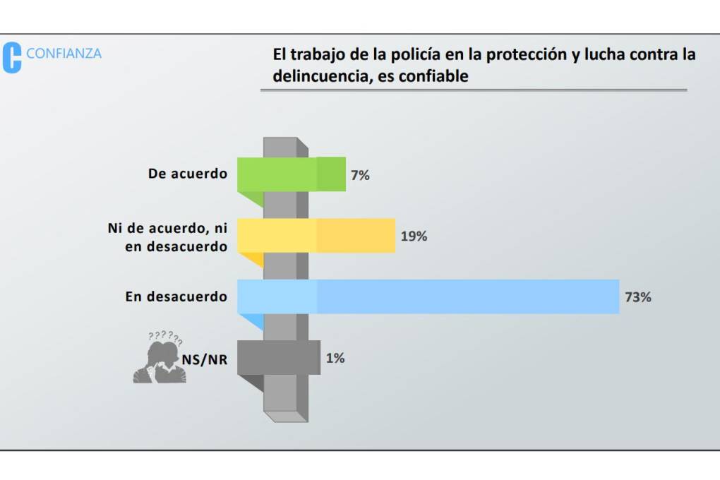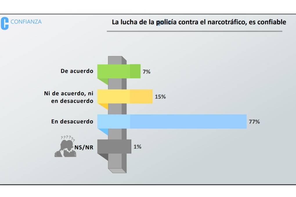 En el caso de la Policía, el 73% de los encuestados dijo que no confía en el trabajo de esa institución en la lucha contra la delincuencia, mientras que el 77% dice que desconfía de su labor en materia de lucha contra el narcotráfico.