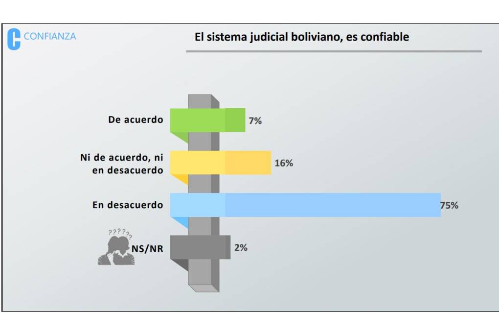 Los resultados del estudio reflejan que el 75% de los encuestados sostiene que el sistema judicial boliviano no es confiable, frente a un 7% que sí confía. El 16% indica que ni está de acuerdo con ello ni en desacuerdo.