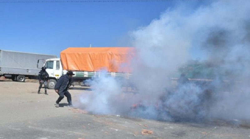 Efectivos de la Policía gasificó y levantó el punto de bloqueo que instaló el transporte pesado en la carretera La Paz-Oruro, a la altura del sector de Apacheta.