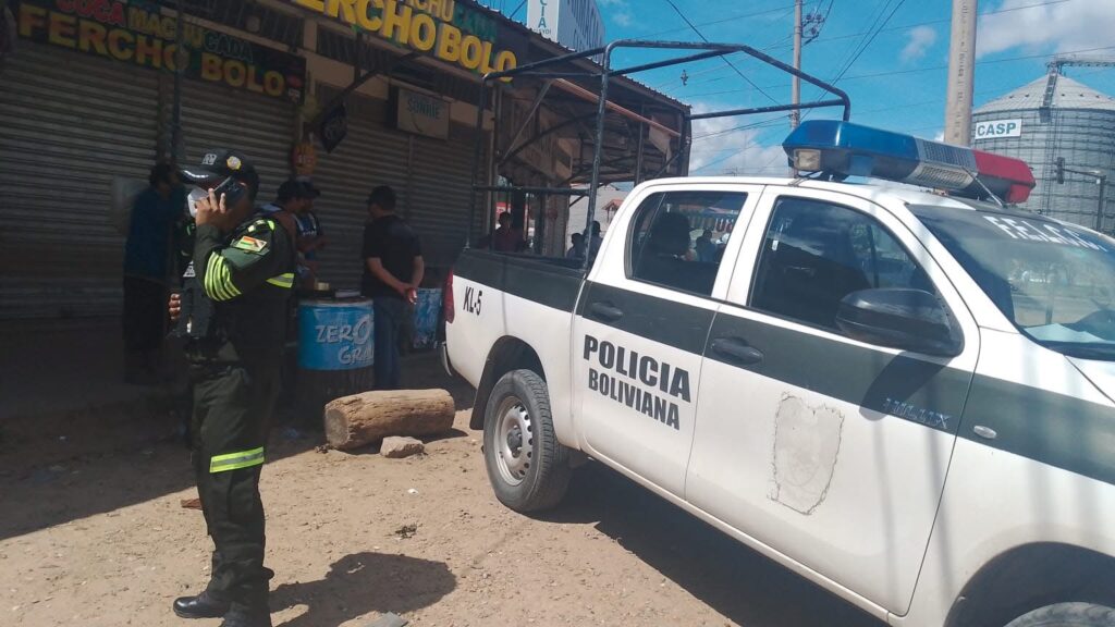 Efectivos de la Fuerza Especial de Lucha Contra el Crimen (FELCC) se encuentran desplegados en un local de venta de coca machucada, donde una persona fue hallada sin vida.