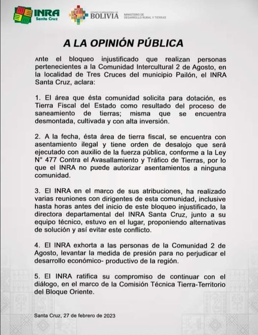 “El INRA exhorta a las personas de la Comunidad 2 de Agosto, levantar la medida de presión para no perjudicar el desarrollo económico- productivo de la región. El INRA ratifica su compromiso de continuar con el diálogo, en el marco de la Comisión Técnica Tierra-Territorio del Bloque Oriente”, concluye el comunicado.